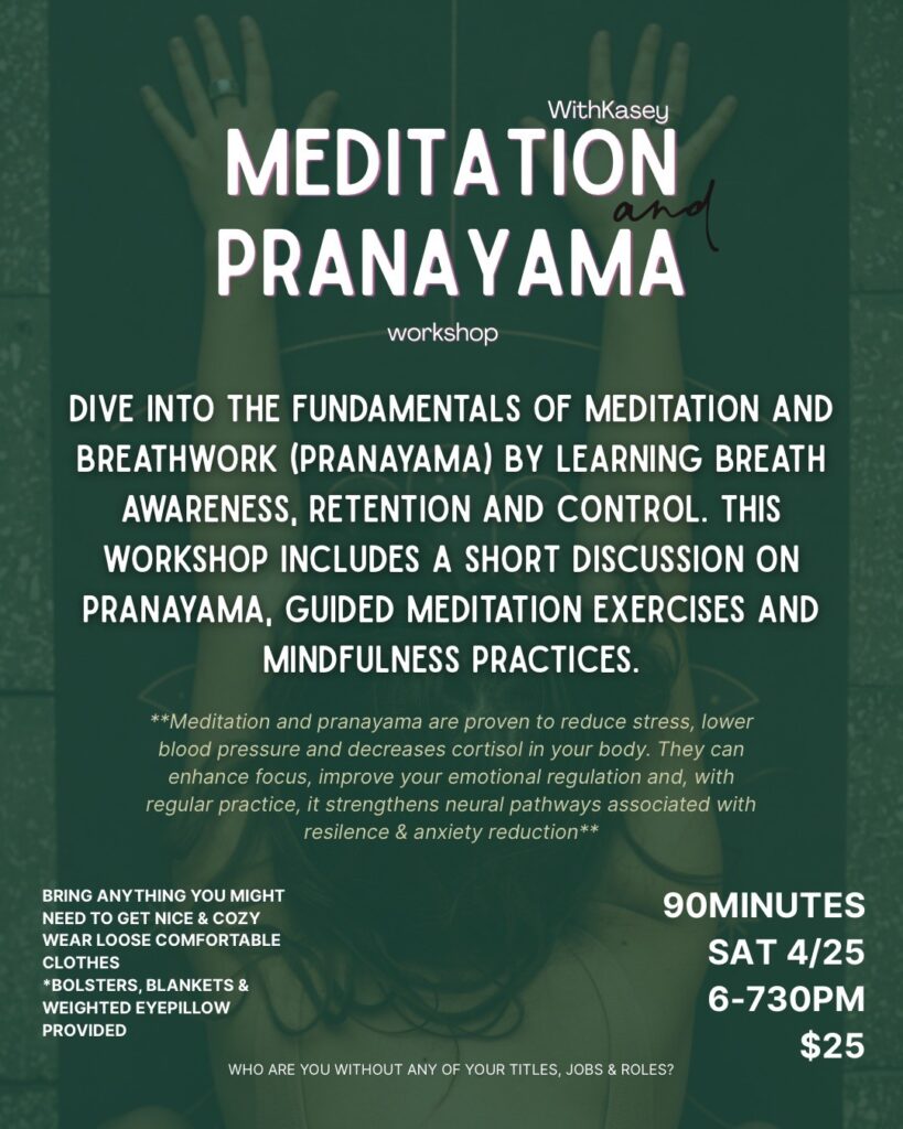 Relax and get comfy and dive into the world of meditation and pranayama. Kasey will lead you through discussion, guided meditation, pranayama and mindfulness practices aimed to improve your relationship with the breath, your nervous system & your consciousness. Meditation and pranayama are both proven to improve your emotional stability, lower cortisol levels and release tension in your body. Lay down, let all your titles float away and discover what you are underneath it all while building a better relationship with your breath and body.